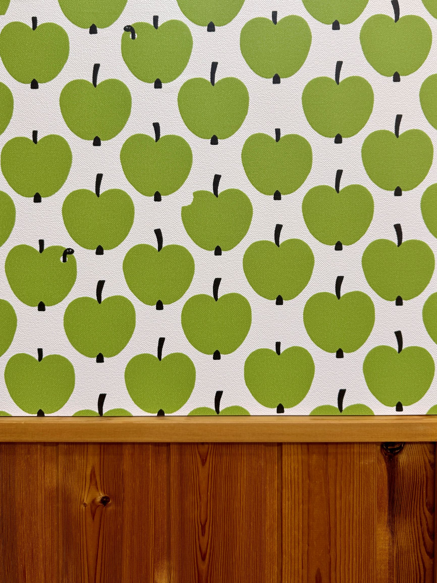 北出 「エレファンティ」などは、壁に貼る際に可愛く見える象さんの大きさを調整して開発しています。大きすぎると圧迫感が出ますし、小さすぎると柄の良さが生かせませんから。それから、触っていただくとわかるのですが、発泡するインクを使ったロータリー製法によって、象さんがぷっくり立体的になっています。「オンップ」というリンゴの柄なども、この製法でぷくぷくと可愛らしくなるように作っています。リンゴの形もひとつずつ調整して、壁に貼ったときに同じものが一直線に並んで見える柄クセなどが出ないようにレイアウトを工夫しています。
