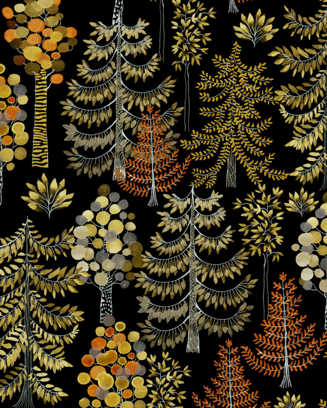 北出 パターンを決めていくときは、元のデザインの良さやフィンレイソンらしさは生かしながら、日本のインテリアとの相性が良いように少し彩度を抑えるなどの調整を行なっています。たとえば「サドゥッサ」という木々を描いた柄があるのですが、これはもともと黒い背景だったんです。でも、壁紙が真っ黒だと少し怖い印象もあるので、最終的には背景を白に反転させるデザインとなりました。